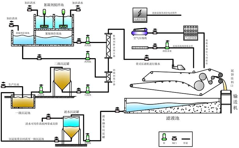 經(jīng)過(guò)濃縮的污泥與一定濃度的絮凝劑在靜、動(dòng)態(tài)混合器中充分混合以后,污泥中的微小固體顆粒聚凝成體積較大的絮狀團(tuán)塊,同時(shí)分離出自由水,絮凝后的污泥被輸送到濃縮重力脫水的濾帶上,在重力的作用下自由水被分離,形成不流動(dòng)狀態(tài)的污泥,然后夾持在上下兩條網(wǎng)帶之間,經(jīng)過(guò)楔形預(yù)壓區(qū)、低壓區(qū)和高壓區(qū)由小到大的擠壓力、剪切力作用下,逐步擠壓污泥,以達(dá)到最大程度的泥水分離,最后形成濾餅排出。