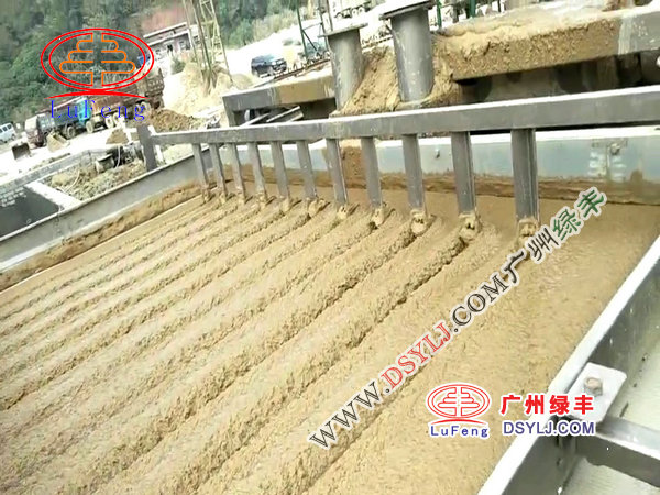 洗砂泥水分離脫水—某大型水洗砂泥漿處理現(xiàn)場效果,采用機型3DYQN3000ZL4, 有效帶寬3米分體式帶式污泥脫水機,總長14.2米,每小時處理量60-80m3/h,重16.5T